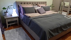 Думала себе просто кровать заменить, но увидела в распродаже этот комплект и не удержалась. До этого рассматривала обычную кровать, но мягкое изголовье все же хотелось, тут оно кстати толще обычного и ощущение, что лежишь на подушках)) Плюс расцветка тут интересная, не однотонная. Ну и подкупила тумба, по сути она как большой короб, зазоров нет, поэтому скопления пыли не будет))