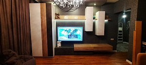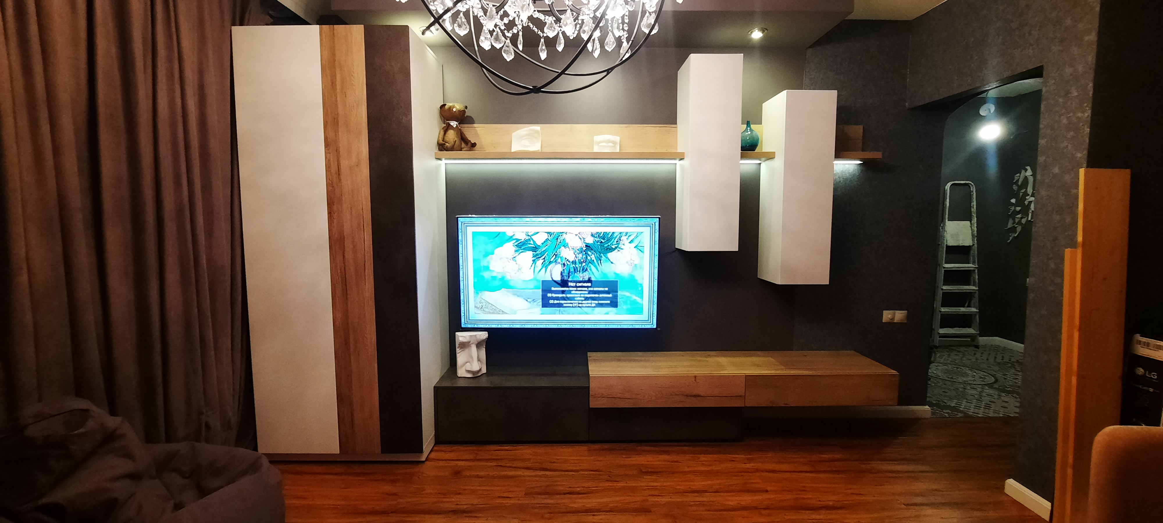 Гостиная хорошая и функциональная, что немало важно - ящики, полочки вместительные. Хотя с теми же полками были проблемы, потому что привезли полку с трещиной. Заменили, но не быстро, пришлось немного подождать. Но вот уже месяц любуемся новой гостиной, выглядит и в правду хорошо!