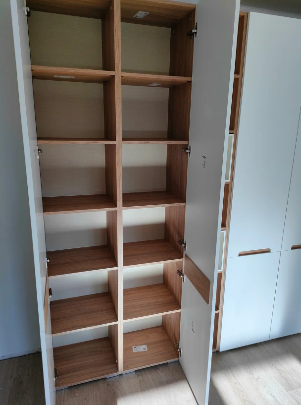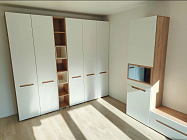 Качественный и вместительный шкаф. Очень удобно, что наполнение шкафов можно выбрать самому. Так же удобно, что в шкафах есть отверстия под любое расположение полок. Можно передвигать полки на любой уровень. Мощные тяжелые фасады из МДФ, петли и ящики на доводчиках. Удобная и красивая мебель. Спасибо