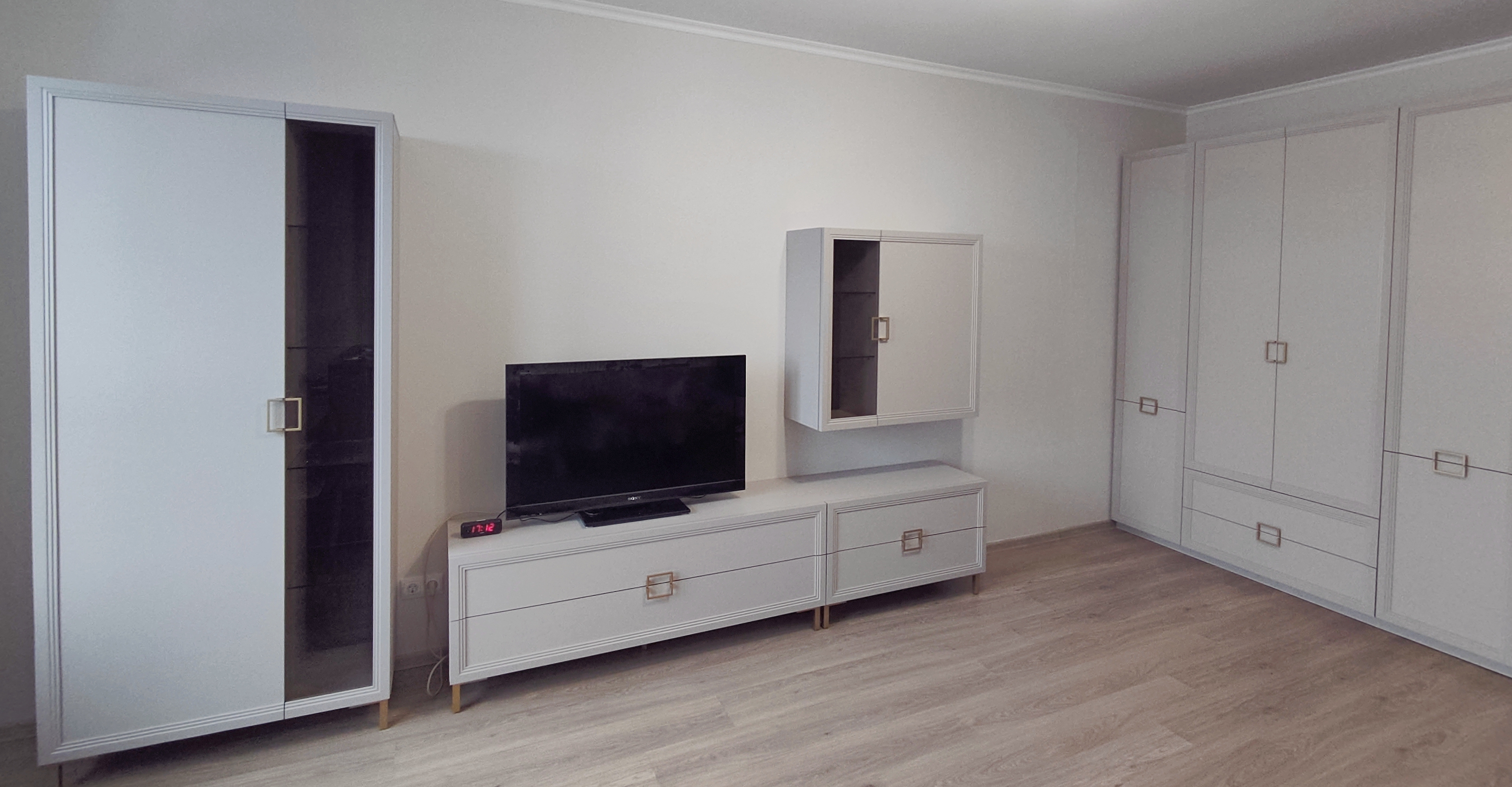 Искали тумбу под телевизор в гостиную — жена хотела что-то в деревенском стиле, но не слишком вычурное. В итоге взяли кантри в светлом оттенке (почти белый, но с рисунком под дерево). Выглядит симпатично, но не без косяков.
