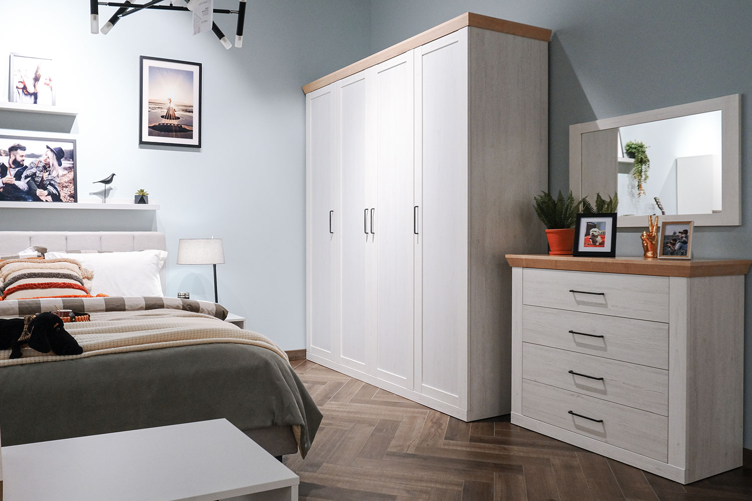 Мебель выполнена в цветах «блан шене» и «дуб бунратти»;