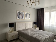- Декоративная акцентная рама в изголовье кровати повторяет форму ручек.