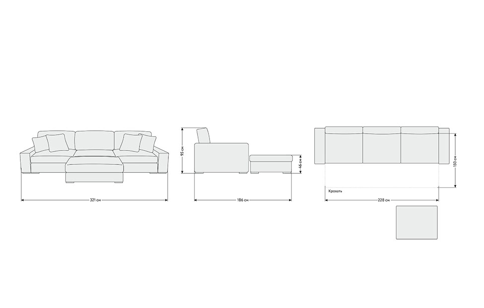 – описание: размер 95x321x186 см, цвет синий (alpina 12), стиль современный, размер спального места 150 х 270 см.
