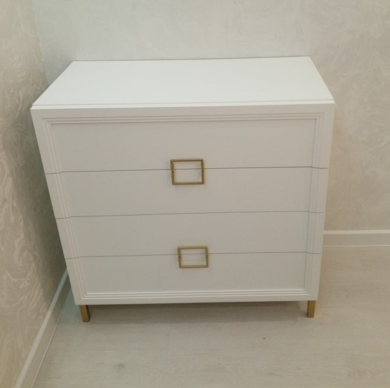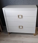 Элегантный лаконичный комод с четкими прямыми линиями будет превосходно смотреться в спальне, гостиной, прихожей, оформленной в стиле ар-деко или минимализм. Четыре выдвижных ящика визуально объединены рисунком квадратных ручек. Изящный оттенок «белый премиум», фурнитура и опоры «под золото» только усиливают эффектность мебели.