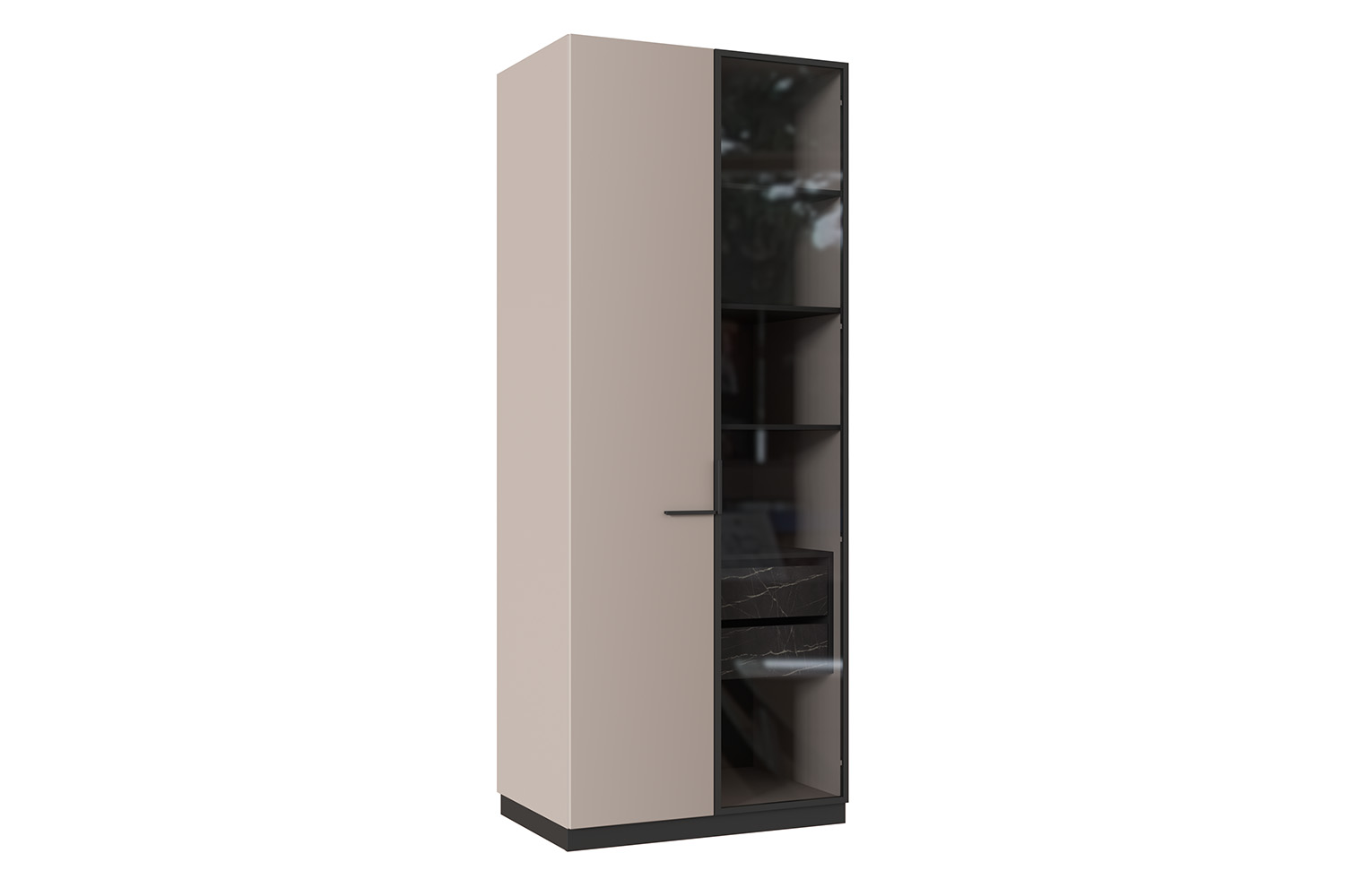 - Один фасад глухой из МДФ 19 мм в пленке ПВХ, а другой рамочный – профиль алюминиевый, стекло затемненное;
