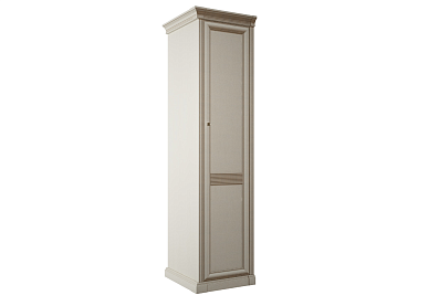 Изделие представляет собой современное прочтение классического дизайна. Шкаф имеет традиционную рамочную конструкцию, глухие фасады декорированы стильными элементами фахверками. Композицию органично дополняют вставки со сложной фрезеровкой и элегантная фурнитура в виде ручек-скоб в оттенке «античная бронза». Металлические опоры позволяют регулировать высоту мебели соответственно неровностям напольного покрытия. Цоколь из МДФ-профиля изящно скрывает прочные ножки.